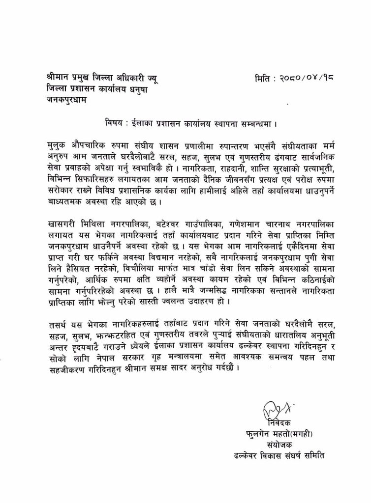 ढल्केवर भेगका नागरिकहरुलाई जिल्ला प्रशासन कार्यालय धनुषा जनकपुरबाट प्रदान गरिने सेवा जनताको घरदैलोमै सरल, सहज, सुलभ, झन्झटरहित एवं गुणस्तरीय तवरले पु¥याई संघीयताको धारातलिय अनुभूती अन्तर ह्ृदयबाटै गराउने ध्येयले ईलाका प्रशासन कार्यालय ढल्केवर स्थापना गरिदिन र सोको लागि नेपाल सरकार गृह मन्त्रालयमा समेत आवश्यक समन्वय पहल तथा सहजीकरण गरिदिन उक्त ज्ञापनपत्रमा उल्लेख छ ।