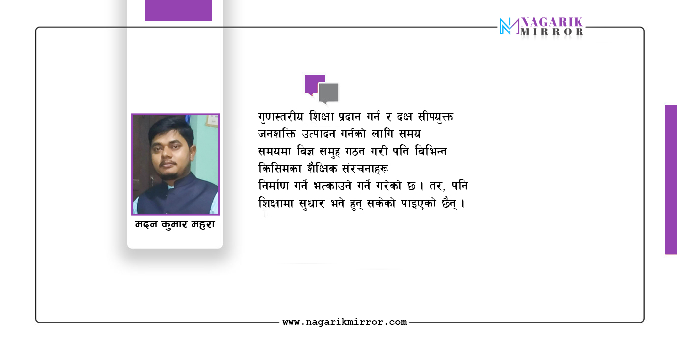 नेपालको शिक्षा क्षेत्रमा परिवर्तन साथै गुणस्तरीय सीपयुक्त दक्षजनशक्ति उत्पादनमा समग्र नेपाल सरकार र दात्री निकायका संयन्त्रहरू आ–आफ्नो निकायबाट लागेर भए पनि उपलब्धी भन्ने त्यस अनुसारको आइरहेको छैन । गुणस्तरीय शिक्षा प्रदान गर्न र दक्ष सीपयुक्त जनशक्ति उत्पादन गर्नको लागि समय समयमा विज्ञ समुह गठन गरी पनि विभिन्न किसिमका शैक्षिक संरचनाहरू निर्माण गर्ने भत्काउने गर्ने गरेको छ । तर, पनि शिक्षामा सुधार भने हुन् सकेको पाइएको छैन ।