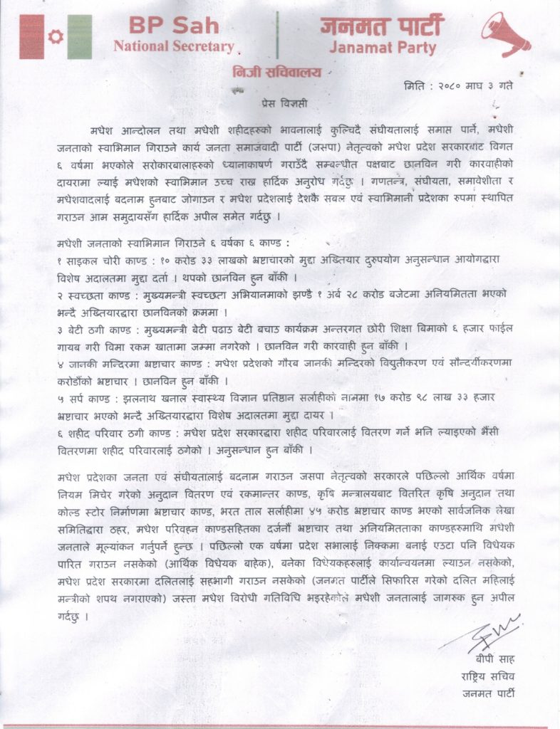जनमत पार्टीद्धारा जारी विज्ञप्तिमा भनिएको छ, ‘मधेश आन्दोलन तथा मधेशी शहीदहरुको भावनालाई कुल्चिदै संघीयतालाई समाप्त पार्ने, मधेशी जनताको स्वाभिमान गिराउने कार्य जनता समाजवादी पार्टी (जसपा) नेतृत्वको मधेश प्रदेश सरकारबाट विगत ६ वर्षमा भएकोले सरोकारबालाहरुको ध्यानाकाषर्ण गराउँदै सम्बन्धीत पक्षबाट छानविन गरी कारवाहीको दायरामा ल्याई मधेशको स्वाभिमान उच्च राख्न हार्दिक अनुरोध गर्दछु ।’