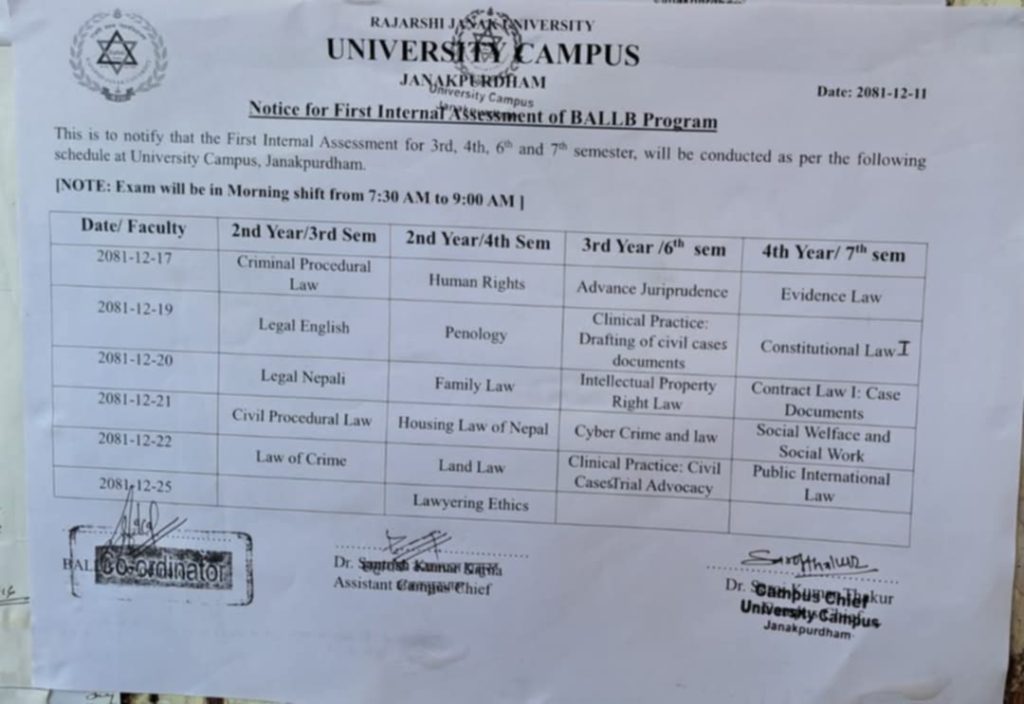 जनकपुरधाम । राजर्षि जनक विश्वविद्यालयको परीक्षा तालिका पुनरावलोकन गर्न मुस्लिम विद्यार्थीहरूले माग गरेका छन्। विश्वविद्यालयमा अध्ययनरत मुस्लिम विद्यार्थीहरूले आफुहरुको एक महिने कठोर पर्व रमजानलाई मध्यनजर गर्दै परीक्षा तालिका पुनरावलोकन गर्न आग्रह गरेका हुन्।
