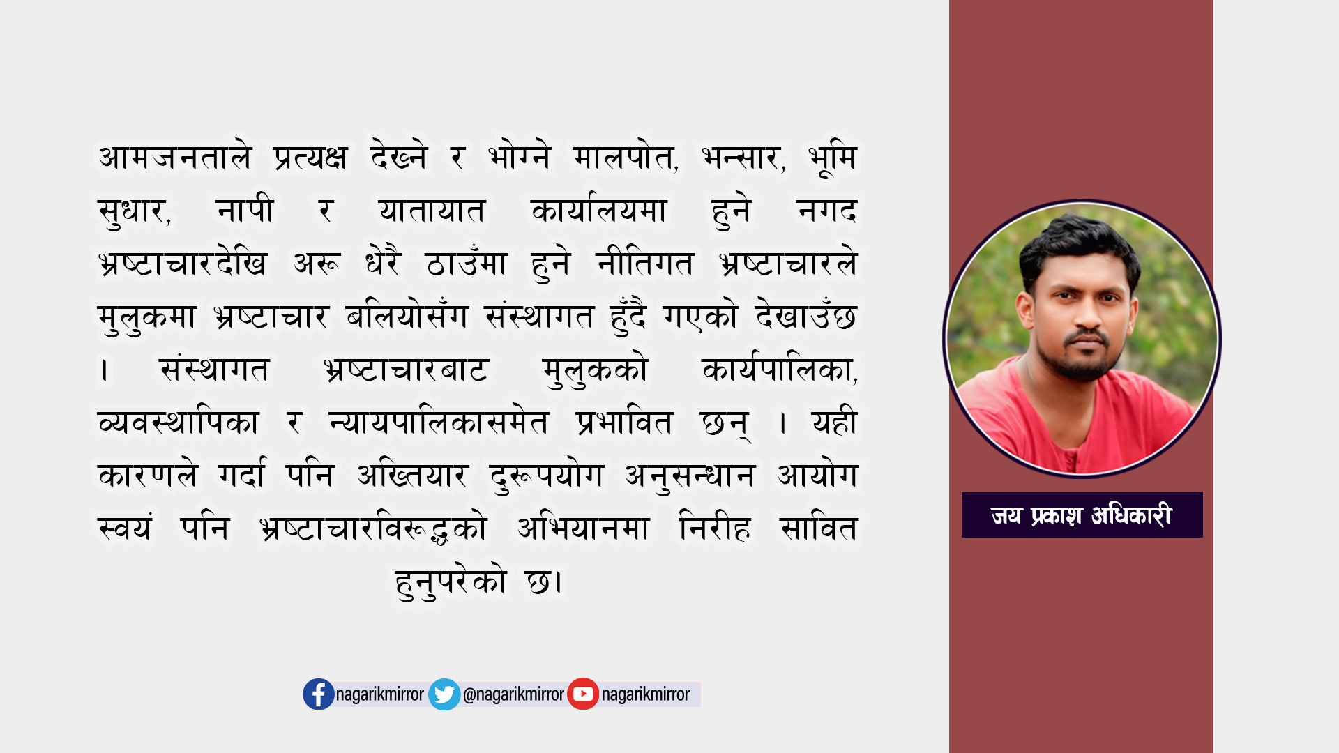 भ्रष्टाचारको जरा गहिरो रुपमा गाडिसकिएको अवस्था छ । तर यदि हामी सबै मिलेर यसविरुद्ध आवाज उठाउने हो भने सुधार असम्भव भने छैन । यो घाउ गहिरो छ, तर उपचार सम्भव छ — केवल ईच्छाशक्ति र इमानदारी चाहिन्छ ।