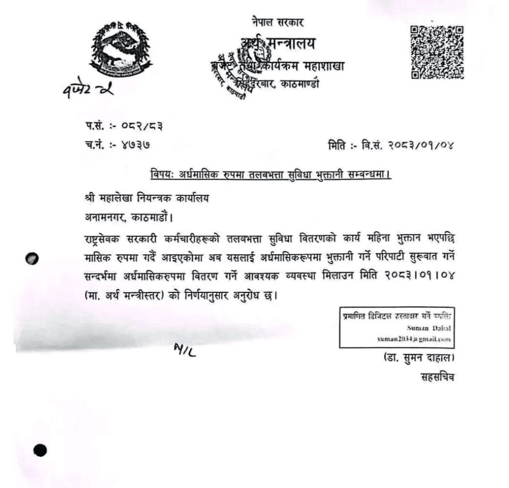 अर्धमासिक रुपमा भुक्तानी गर्ने परिपाटी सुरुवात गर्न अर्थमन्त्री स्तरीय निर्णय गर्दै नयाँ व्यवस्था लागू गरिएको मन्त्रालयका सहसचिव डा.सुमन दाहालले बताए।