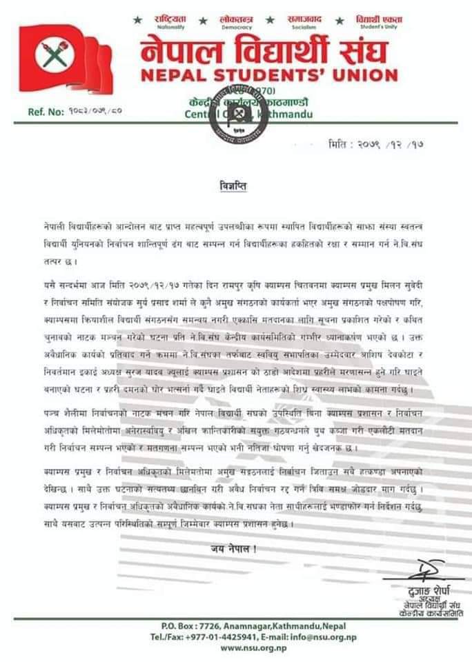 त्यस्तै कांग्रेस निकट नेविसंघले भने निर्वाचन नस्वीकार्ने समेत प्रेस विज्ञप्तिमा उल्लेख छ । निर्वाचनमा धाँधली तथा वुथ क्याप्चर भएको र त्यसको जिम्मा क्याम्पस प्रशासनले लिन पर्ने उल्लेख गरिएको छ।