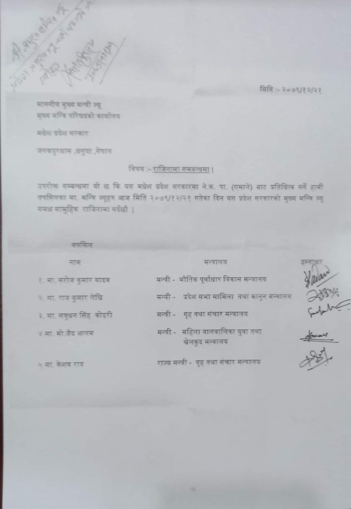 जनकपुरधाम । मधेश प्रदेश सरकारमा रहेका नेकपा एमालेका मन्त्रीहरूले राजीनामा दिएका छन् ।